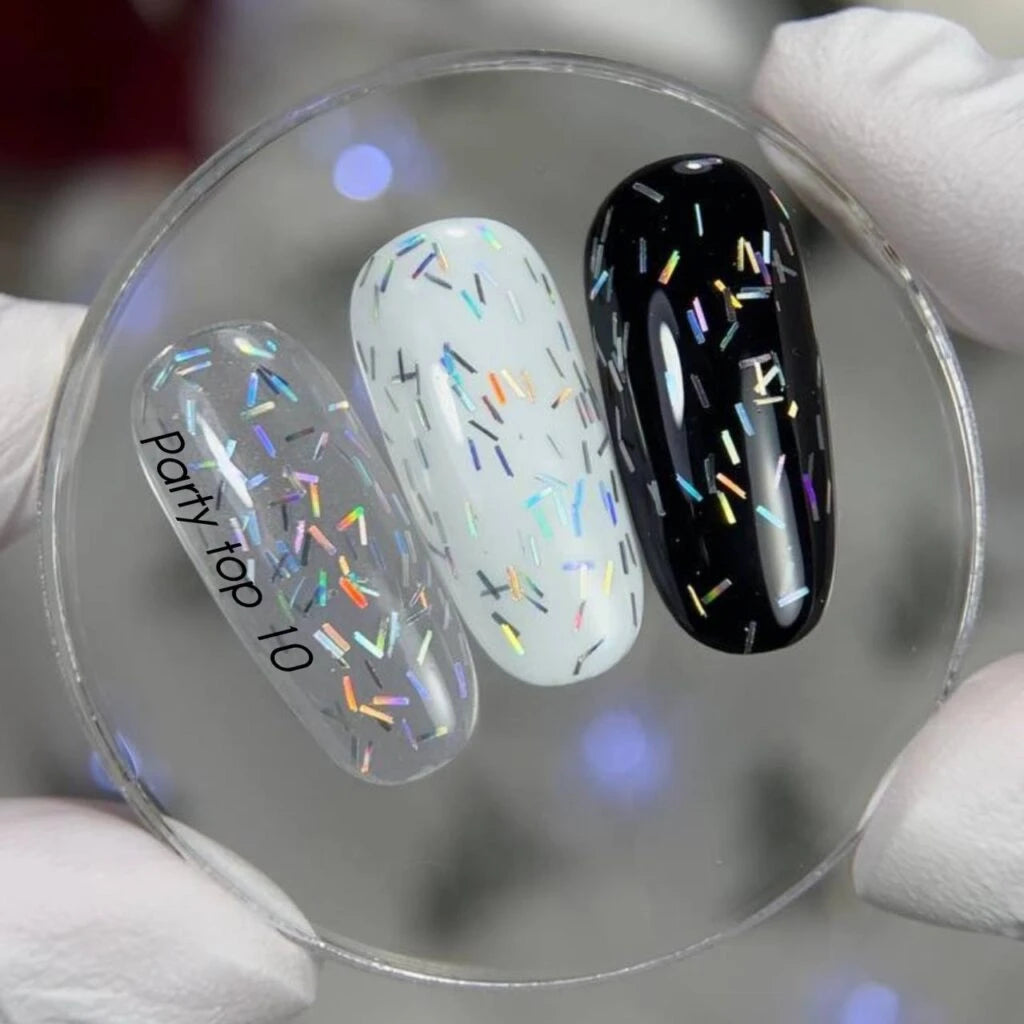 NAILSOFTHEDAY Party Top — a glossy top coat with shimmering silver glitter that sparkles beautifully, without a sticky layer. Thanks to our unique formula, it levels perfectly and provides full coverage of the nail plate. It prevents chipping and scratching. It has a medium consistency.