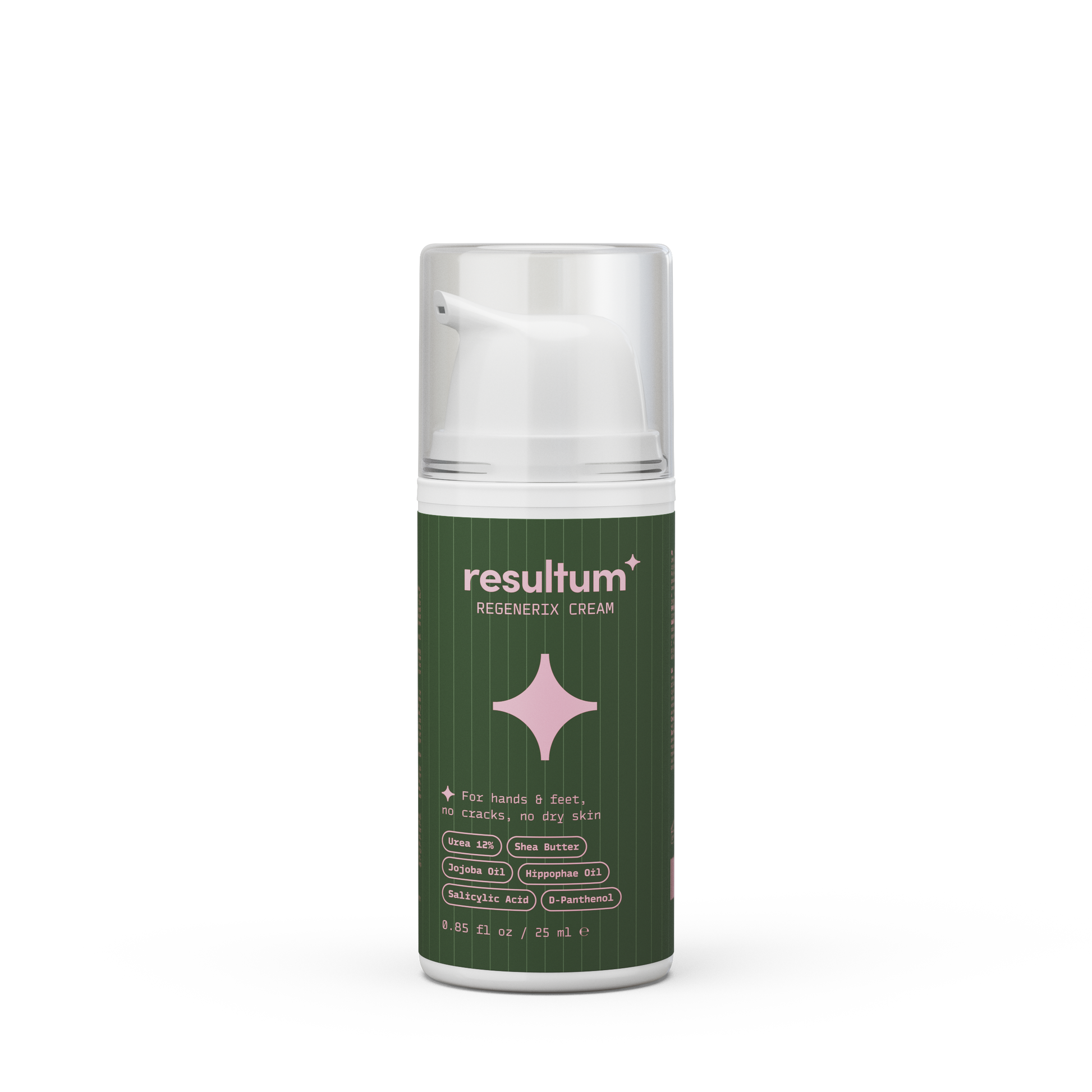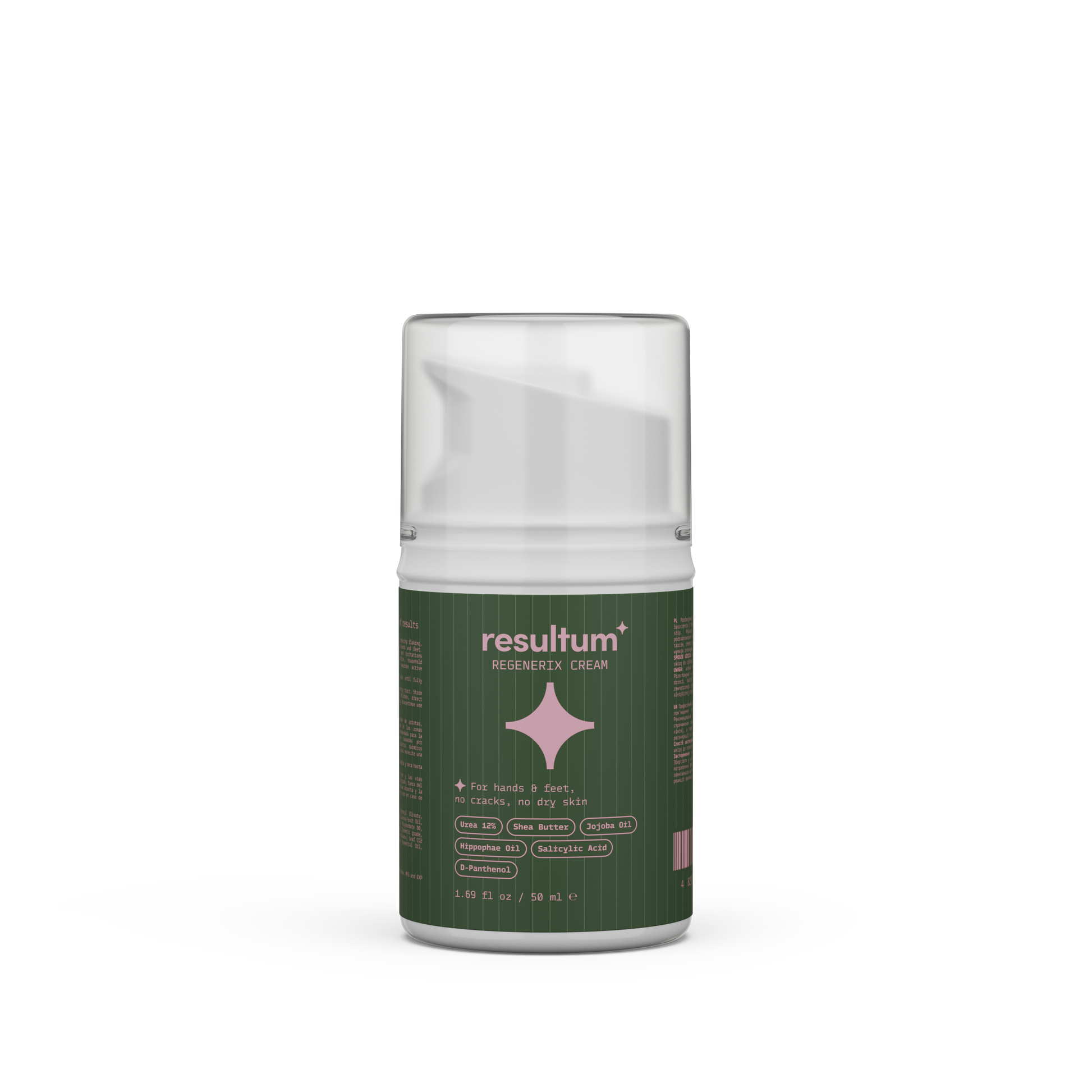 Resultum Regenerix Cream — a professional regenerating cream with enhanced lipid restoration and a comfortable sensory texture. It deeply nourishes, heals cracks, and works on dryness and flaking in the long term. After regeneration and recovery, it is ideal as a nighttime care product for hands and feet. Regenerix is a balance between treatment and care — a next-generation anti-crack formula. It can be used daily on a continuous basis. Its main focus is active regeneration, deep nourishment, and restoration of dry skin prone to cracking.